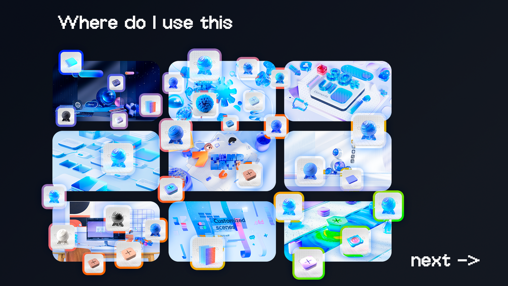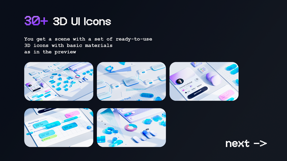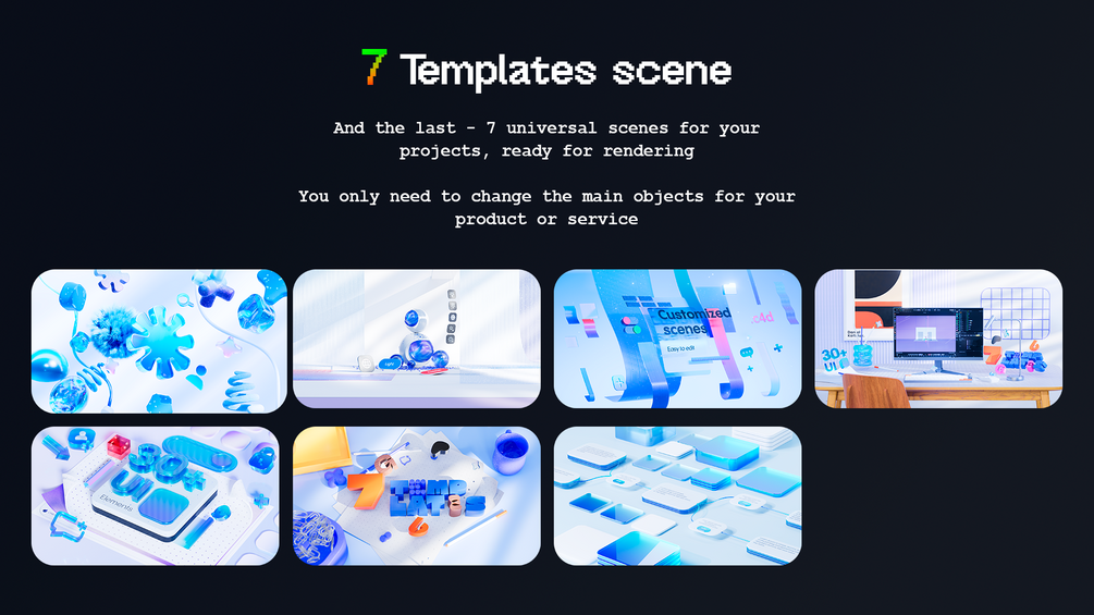 You will get 5 Professional Lighting Setups, 35+ Materials, 7 Animated Template Scenes, 30+ 3D UI Icons